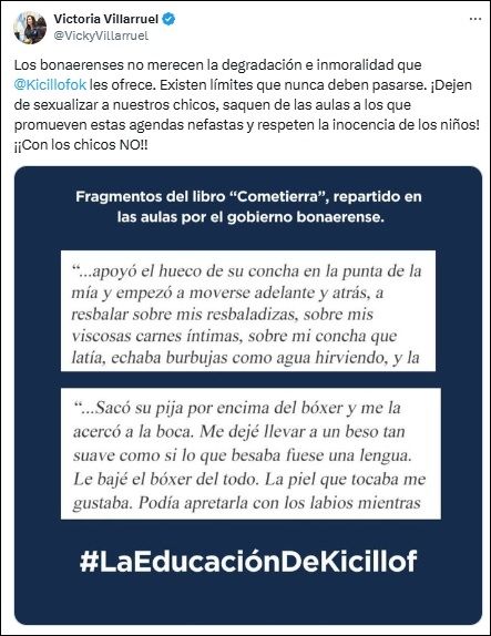 "Los bonaerenses no merecen la degradación e inmoralidad que @Kicillofok les ofrece. Existen límites que nunca deben pasarse", lanzó la vicepresidenta en su cuenta de X, en la que citó fragmentos de un libro.