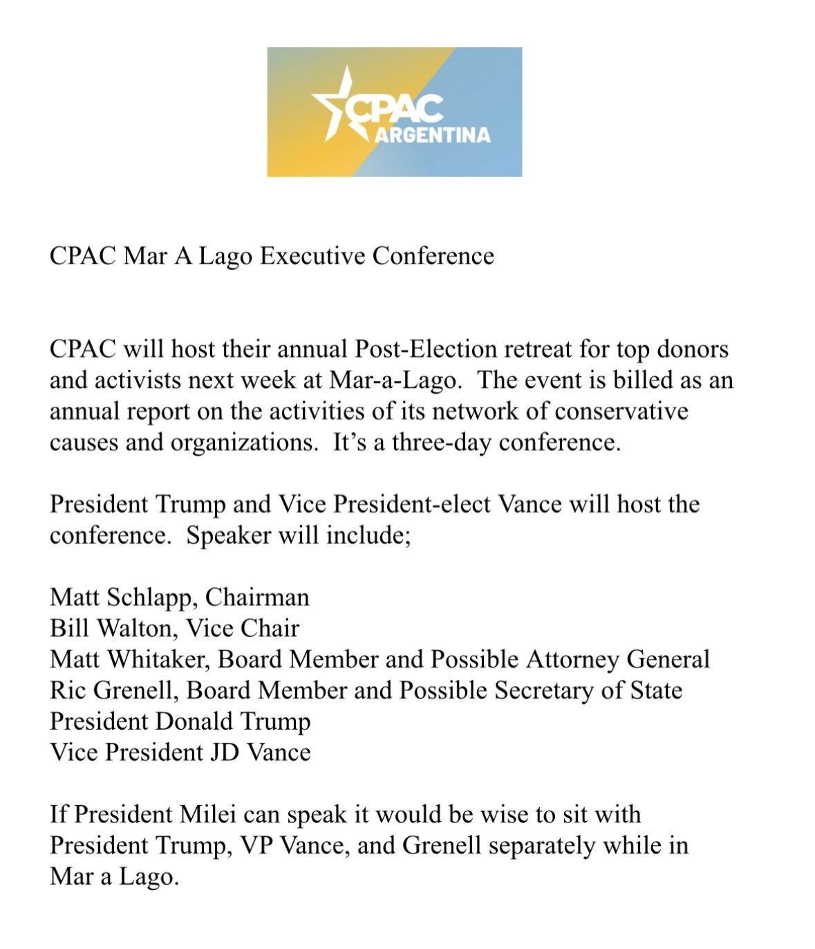El argentino es el único jefe de Estado invitado hasta el momento al evento conservador, donde Trump y su compañero de fórmula, James David Vance, recibirán a los principales donantes y activistas de la campaña electoral del republicano. La conferencia durará 3 días y, entre los principales oradores, estarán - además de la dupla anfitriona- el posible secretario de Estado Ric Grenell, el probable fiscal general Matt Whitaker, y el presidente Javier Milei.
