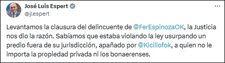 Más tarde, en su cuenta de X, el “Profe” disparó: “Levantamos la clausura del delincuente de Fernando Espinoza, la Justicia nos dio la razón. Sabíamos que estaba violando la ley usurpando un predio fuera de su jurisdicción, apañado por Axel Kicillof, a quien no le importa la propiedad privada ni los bonaerenses”.