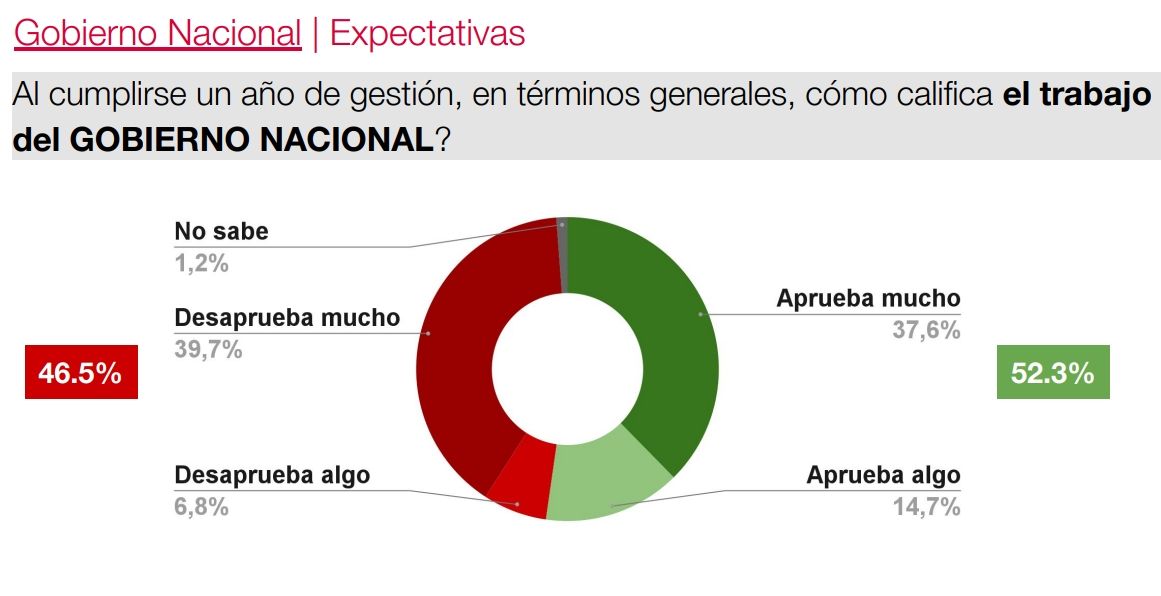 Un estudio de CB Consultora reveló que el 52,3% de los 1.562 casos encuestados aprueba el trabajo del Gobierno nacional a un año de gestión. Dentro de ese grupo, el 37,6% aprueba mucho, mientras que un 14,7% lo hace en menor medida. En contraposición, la administración libertaria enfrenta un rechazo del 46,5%, dentro del cual un 39,7% lo hace tajantemente y otro 6,8% lo hace con menos fuerza.