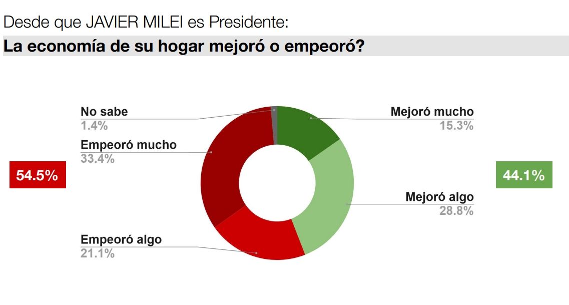 Sin embargo, ese optimismo no se ve reflejado en la percepción económica de los consultados, ya que un 54,5% reconoció que la economía de su hogar empeoró bajo el mandato de Javier Milei, mientras que un 44,1% sostuvo que mejoró. En el 33,4% de los casos, la situación familiar "empeoró mucho".