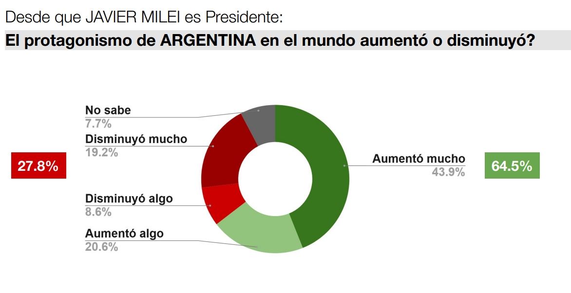 La compensación del factor económico llegó a través de la percepción del protagonismo de Argentina en el mundo, que enfrentó un aumento según el 64,5% de los consultados. El primer año de gestión de Milei estuvo caracterizado por sus viajes al exterior donde se reunió con figuras de peso global del mundo empresarial y político. A su vez, sus discursos en foros internacionales como el Foro de Davos, la ONU o el G20 también capturaron la atención de medios y el público de diversos lugares del planeta.