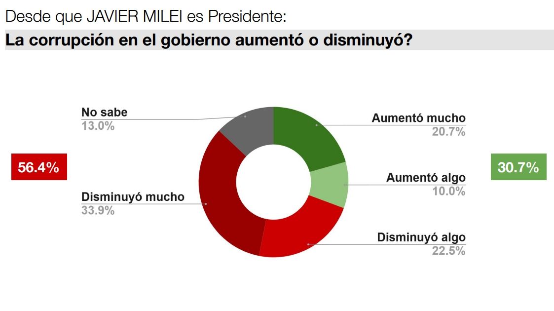A su vez, el 56,4% destacó la caída de la corrupción, una de las principales consignas del Gobierno, contra un 30,7% que observó un aumento en la materia. La "abanderada" de Milei en esa cruzada fue la ministra de Capital Humano, Sandra Pettovello, que según el presidente "está sacando a la luz lo peor de la corrupción política" a través de sus auditorías a organizaciones sociales y otras dependencias del Gobierno.