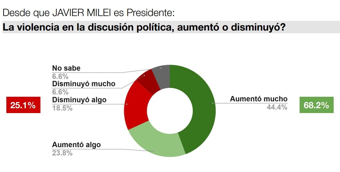 Sin embargo, un dato alarmante fue el aumento en la violencia en la discusión política, que según el 68,2% de los encuestados se incrementó durante el Gobierno de La Libertad Avanza. La apreciación va de la mano con el lenguaje presidencial, caracterizado por insultar sin tapujos a dirigentes de la oposición y otras figuras críticas de su Gobierno.