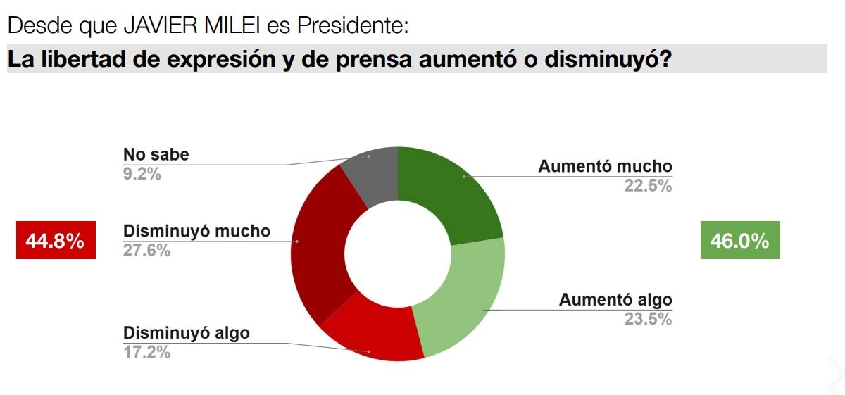 En paralelo, la percepción sobre la libertad de expresión y de prensa fue uno de los focos más discutidos, ya que el 46% consideró que esta aumentó durante la gestión de Milei, mientras que un 44,8% opina que la misma disminuyó. Ese debate está marcado por las frecuentes críticas del mandatario contra quienes llama "periodistas ensobrados" y a los medios "adictos a la pauta". Desde el Gobierno han rechazado en varias ocasiones que esas expresiones atenten contra la libertad de expresión y argumentaron que, al contrario, sus formas apuntan a terminar con el "monopolio del micrófono".