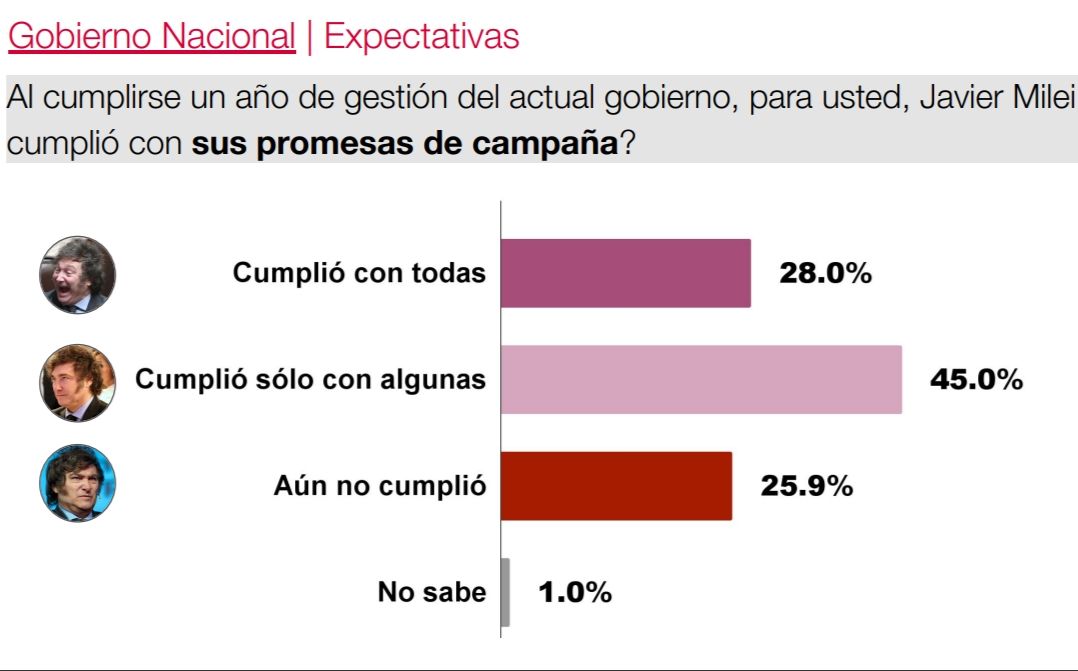 Finalmente, los encuestados fueron consultados acerca de si Milei cumplió o no sus promesas de campaña durante sus primeros 365 días en la Casa Rosada. En ese marco, el 28% celebró la ejecución de la totalidad de los compromisos que el libertario hizo en 2023, mientras que un 45% fue más cauto y señaló que cumplió "solo algunas". Para cerrar, el 25,9% reclamó que el presidente todavía no satisfizo las expectativas alimentadas durante las elecciones. El próximo año se verá si el presidente tacha algunas tareas de su lista de pendientes.
