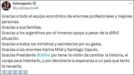 “Gracias a todo el equipo económico de enormes profesionales y mejores personas. Gracias a sus familias. Gracias a los argentinos por el inmenso apoyo a pesar de la difícil situación”, comenzó escribiendo Caputo.