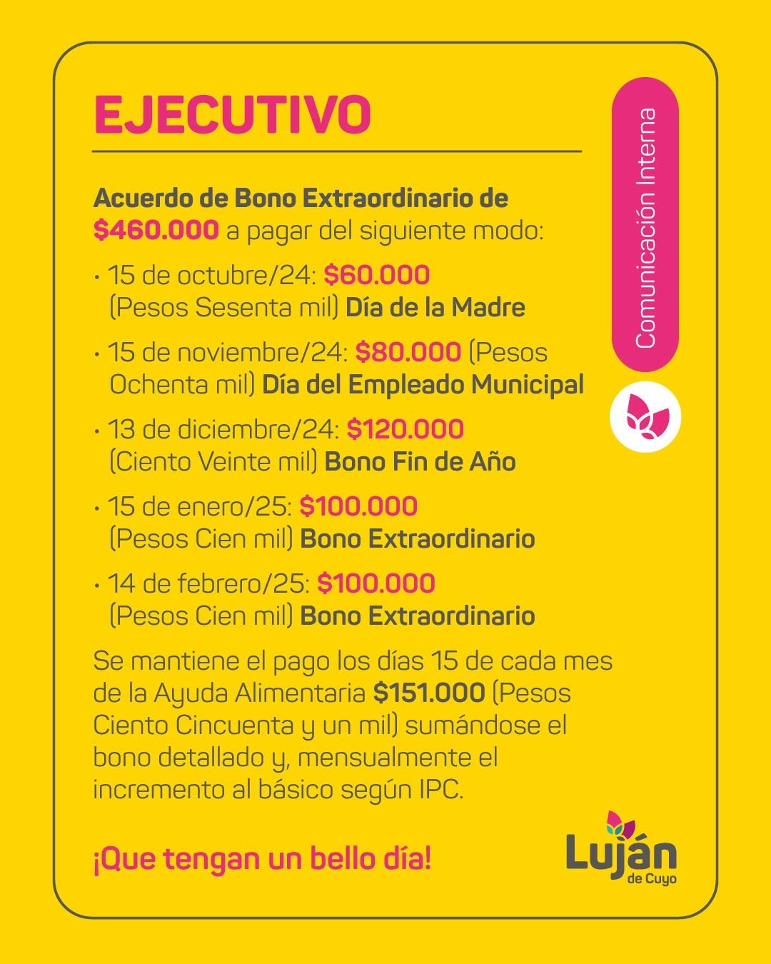 Luján de Cuyo, por su parte, cerró con el sindicato varios bonos desde octubre, que llegan a un total de $460.000. El de fin de año será de $120.000 y el 15 de enero los empleados cobrarán otro bono por $100.000.