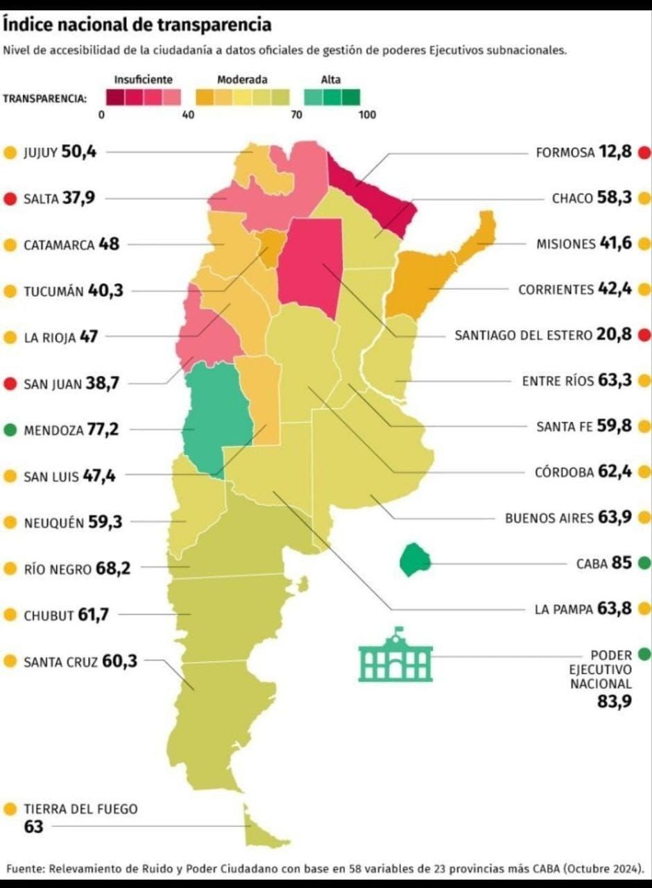 Los Ejecutivos provinciales que quedaron peor parados fueron Formosa (12,8%), Santiago del Estero (20,8%), Salta (37,9%) y nuestra vecina, San Juan (38,6%) que en este examen, sacaron "insuficiente".El INTRA analiza 58 variables diferentes que condensa en 13 ítems que están publicados en planillas en el mismo informe, de cada uno de los distritos.