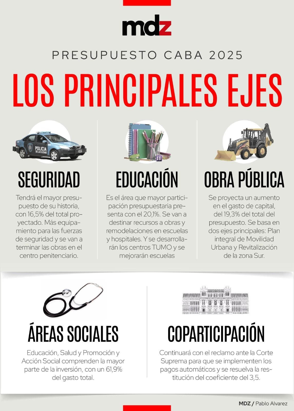 OBRA PÚBLICA: se proyecta un aumento en el gasto de capital, del 19,3% del total del presupuesto, cuando el promedio histórico fue del 16%. Se basa en dos ejes principales: Plan integral de Movilidad Urbana y Revitalización de la zona Sur.