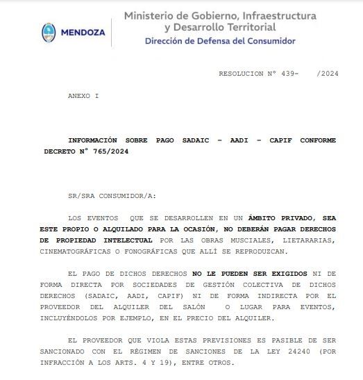 "El pago de dichos derechos no le pueden ser exigidos ni de forma directa por sociedades de gestión colectiva de dichos derechos (Sadaic, AADI Capif) ni de forma indirecta por el proveedor del alquiler del salón o lugar para eventos incluyéndolos por ejemplo, en el precio del alquiler", adhiere en referencia a los salones que incluían el concepto de derechos de propiedad intelectual en el alquiler.