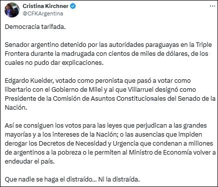 La expresidenta Cristina Kirchner tildó a Kueider de "peronista que "pasó a votar como libertario", un dardo que se cristalizó con un pedido de expulsión presentado por el interbloque kirchnerista por "inhabilidad moral sobreviniente de los hechos de público conocimiento".