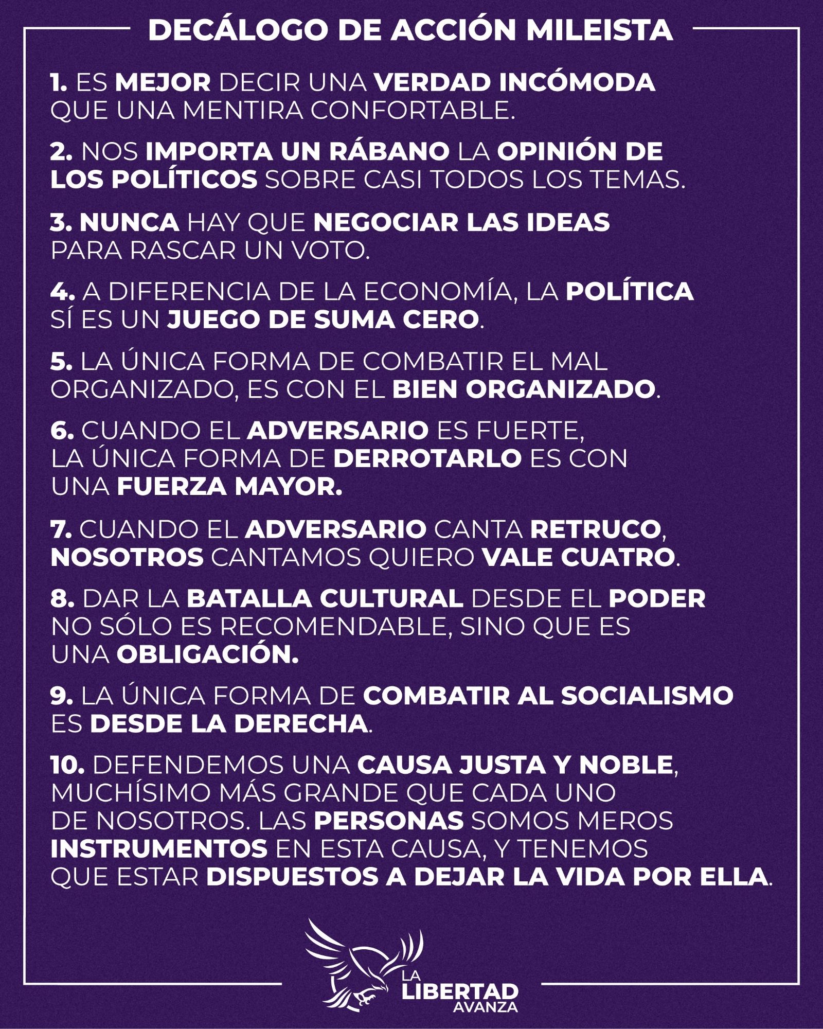 En sintonía con el cuarto punto, el jefe de Estado llamó a sostener los espacios de intercambios de ideas como CPAC para "promover activamente las ideas" y desarrollar "una experiencia de cómo enfrentar a este enemigo tan bien organizado". A la par, como noveno mandamiento, Milei sentenció que "el extremo centro es funcional a la izquierda criminal" y explicó que "no le interesa continuar con los famosos consensos de la política".