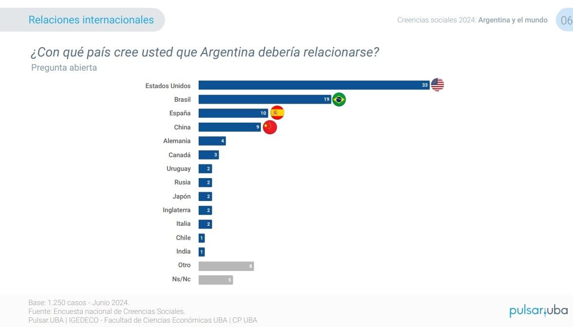 Ante la pregunta sobre con qué país creen que Argentina debería relacionarse, la mayoría de los encuestados respondió que debería ser el país norteamericano. Luego Brasil, España, China, Alemania, Canadá y Uruguay. Al igual que el año pasado, Estados Unidos y Brasil se mantienen como las dos primeras opciones; el primero por su influencia global, y el segundo con una conexión regional evidente.