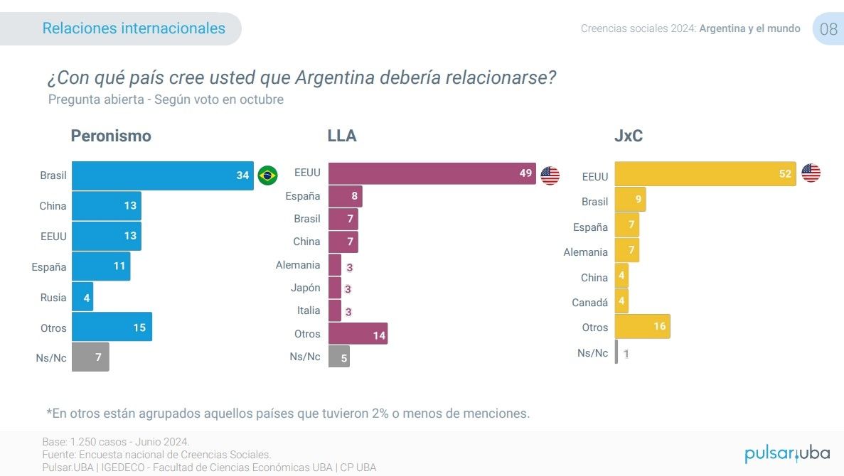 Aquellos más allegados al peronismo, al ser consultados sobre con qué lugar debería relacionarse más Argentina, eligieron en primer lugar a Brasil, luego China y en tercer lugar a los Estados Unidos. Los votantes de La Libertad Avanza optaron por Estados Unidos, España y Brasil. Los de Juntos por el Cambio por Estados Unidos, Brasil y España.