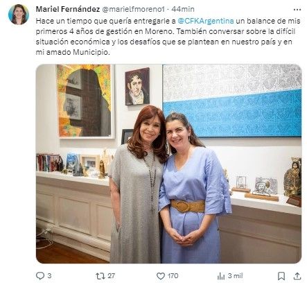 "Hace un tiempo que quería entregarle a Cristina un balance de mis primeros 4 años de gestión en Moreno. También conversar sobre la difícil situación económica y los desafíos que se plantean en nuestro país y en mi amado municipio", escribió la jefa comunal.