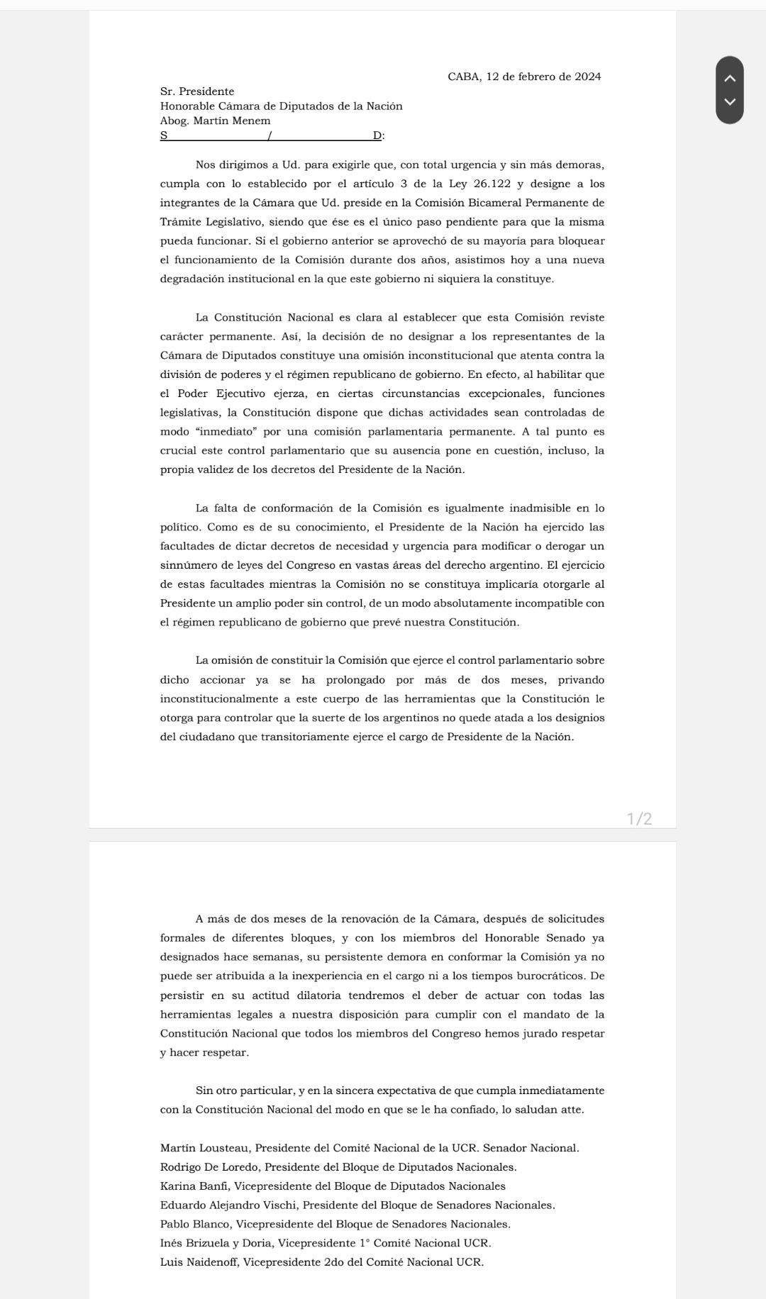 La UCR le solicitó este lunes mediante una carta al presidente de la Cámara de Diputados, Martín Menem, que designe los representantes de la comisión Bicameral para tratar el DNU de desregulación económica dispuesto por Javier Milei.