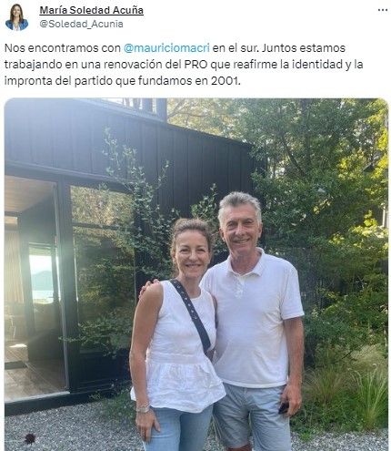 "Nos encontramos con Mauricio Macri en el sur. Juntos estamos trabajando en una renovación del PRO que reafirme la identidad y la impronta del partido que fundamos en 2001", comunicó la exfuncionaria en la red social X, junto a una foto de ambos.