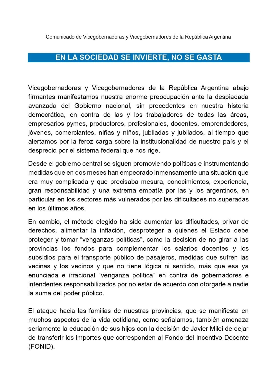 El enfrentamiento de las provincias con Javier Milei sumó un nuevo capítulo este domingo. A través de un documento titulado "En la sociedad se invierte, no se gasta", vicegobernadores de varias provincias rechazaron la medida del Gobierno de recortar subsidios al transporte de colectivos en el interior y suspender el giro del Fondo Nacional de Incentivo Docente (Fonid).