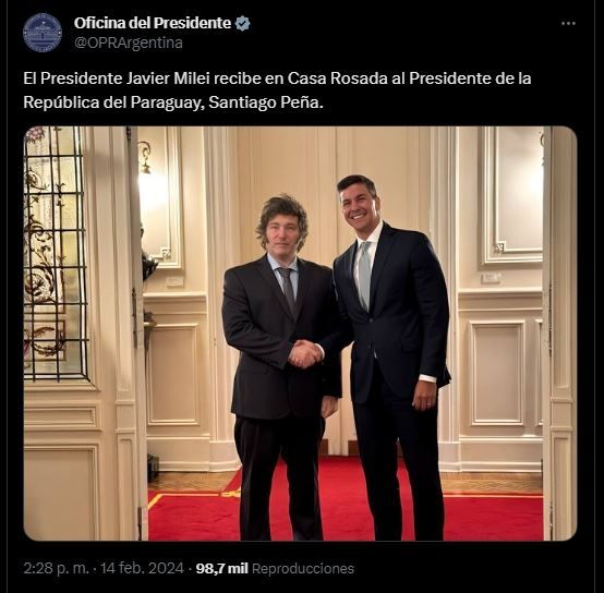 "Con @JMilei, presidente de la República Argentina, hablamos de los desafíos en materia de integración regional, como también sobre la importancia de encarar proyectos estratégicos comunes. Nos une poner el bienestar de nuestros pueblos en primer lugar", destacó el presidente paraguayo en sus redes sociales.
