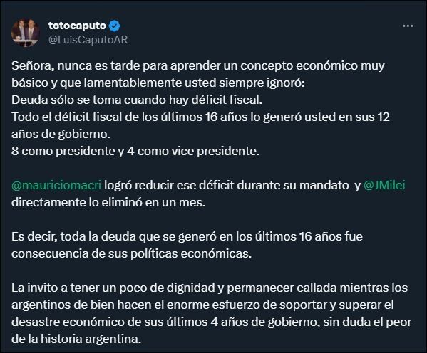 "Señora, nunca es tarde para aprender un concepto económico muy básico y que lamentablemente usted siempre ignoró: Deuda sólo se toma cuando hay déficit fiscal. Todo el déficit fiscal de los últimos 16 años lo generó usted en sus 12 años de gobierno. 8 como presidente y 4 como vice presidente", comenzó diciendo Caputo en su respuesta.
