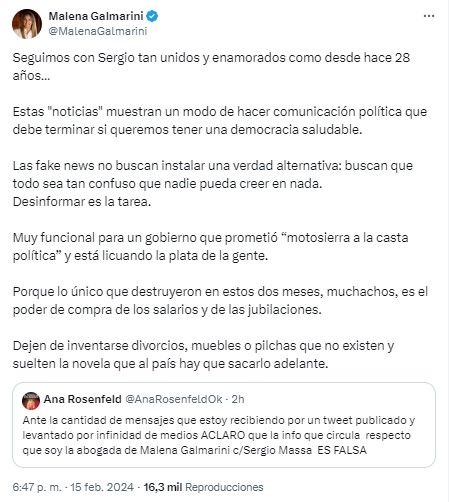 "Seguimos con Sergio tan unidos y enamorados como desde hace 28 años. Estas ´noticias´ muestran un modo de hacer comunicación política que debe terminar si queremos tener una democracia saludable", escribió en la red social X.