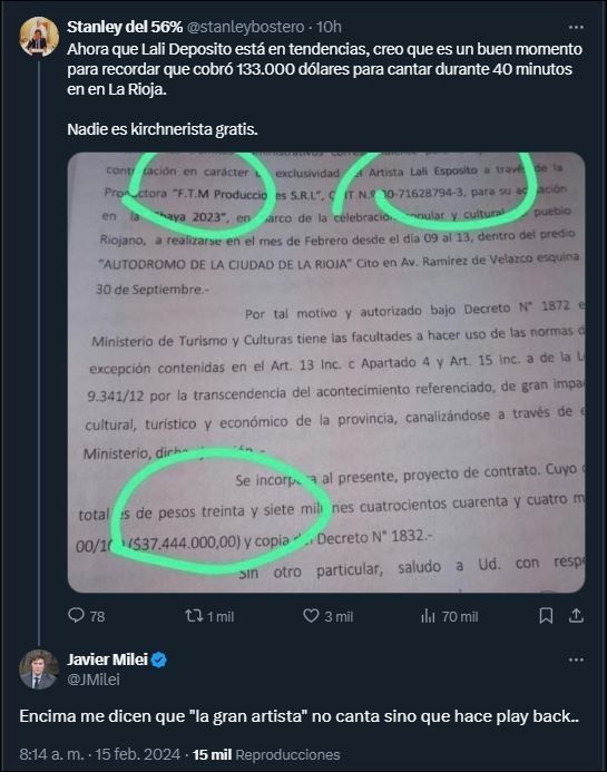 Concretamente, lo de Milei fue una respuesta a un posteo en el que un usuario con un nombre ficticio acusa a la cantante de cobrar "133.000 dólares para cantar durante 40 minutos en en La Rioja".