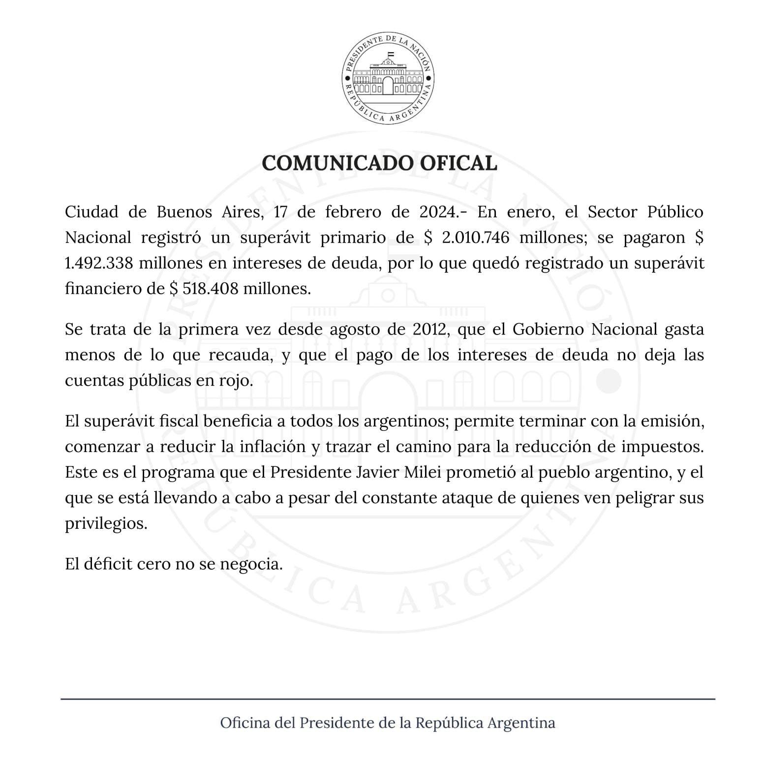 Además, desde Casa Rosada ratificaron que "este es el programa que el presidente Javier Milei prometió al pueblo argentino, y el que se está llevando a cabo a pesar del constante ataque de quienes ven peligrar sus privilegios".