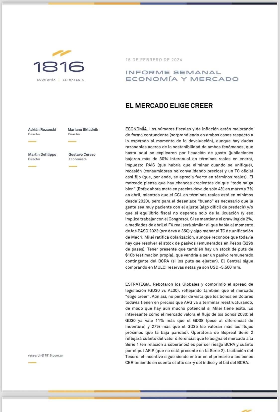 Titulan su último envío: “El mercado elige creer”. Según el enfoque de estos analistas, muy respetados a nivel local y en Wall Street, “los números fiscales y de inflación están mejorando de forma contundente (sorprendiendo en ambos casos respecto a los esperado al momento de la devaluación), aunque hay dudas razonables acerca de la sostenibilidad de ambos fenómenos”. También plantean que “el escenario bueno exista no quiere decir que sea sencillo alcanzarlo: para que el equilibrio fiscal y la desaceleración de la inflación puedan mantenerse en el tiempo es necesario que la ciudadanía tolere ingresos reales en torno a mínimos post-2001 por varios meses y/o que el ajuste fiscal no dependa casi exclusivamente de la licuación del gasto”.