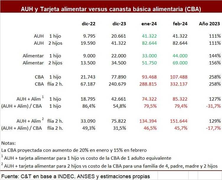 La reacción al ajuste hoy no es igual para todos y claramente el impacto más fuerte lo esta sufriendo la clase media y la clase media alta. Hay indicios ciertos que indican que la variación del poder adquisitivo en los sectores más necesitados se mueve en otro ritmo. Un informe de la economista María Castiglione Cotter explica claramente que “ante la altísima inflación de estos meses, el Gobierno priorizó aumentar las asignaciones directas: AUH (100% desde enero) y alimentar (50% en y 50% febrero). Esto permite mejorar notablemente la cobertura de la CBA”.