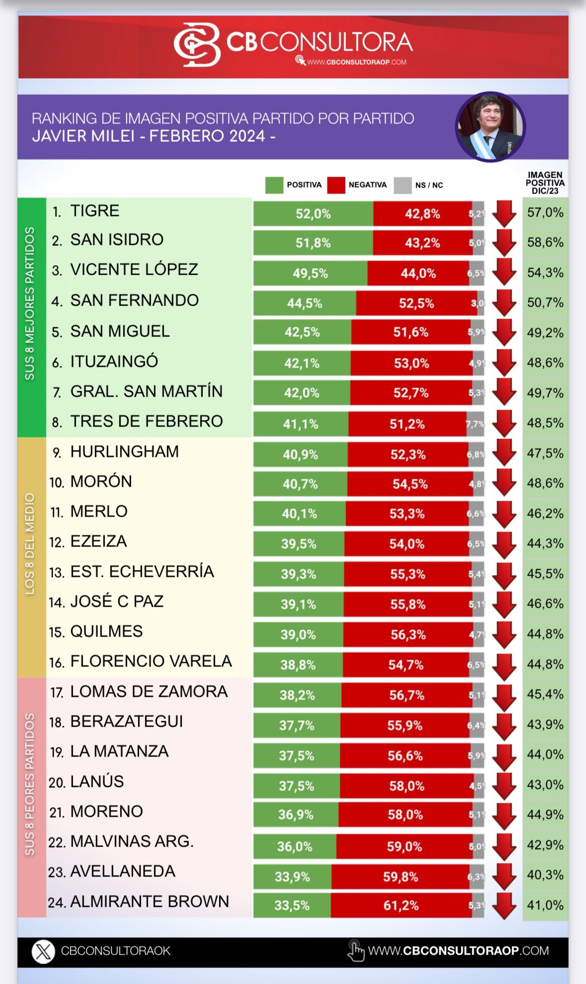 Según el informe realizado por la consultora CB, Milei solo tiene una imagen positiva, sobre la negativa, en tres partidos: Tigre (52,0%), San Isidro (51,8%) y Vicente López (49,5%). Aunque siguen liderando el ránking, en el anterior informe realizado en diciembre, Milei tenía en los partidos antes mencionados una imagen positiva de más del 51%, llegando al 57% en el caso de Tigre.