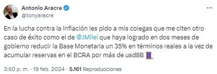 Aracre le respondió compartiendo una nota que señalaba que "la expansión monetaria en los dos primeros meses de la gestión Milei es la menor en los últimos cinco años".