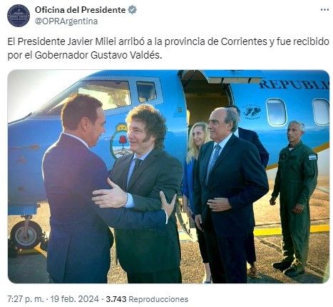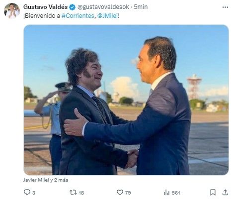 Tanto el mandatario local como la Oficina del Presidente compartieron imágenes del saludo entre ambos. "Bienvenido a Corrientes", escribió Valdés en su cuenta de red social X.
