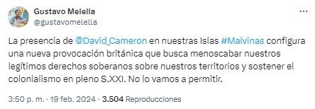El gobernador de Tierra del Fuego, Gustavo Melella, rechazó la visita del canciller de Reino Unido, David Cameron, a las Islas Malvinas mediante un fuerte descargo.