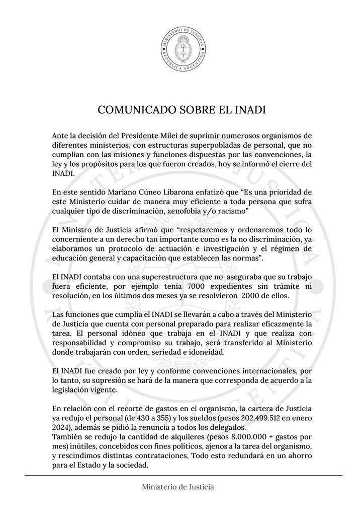 "Las funciones que cumplia el INADI se llevarán a cabo a través del Ministerio de Justicia que cuenta con personal preparado para realizar eficazmente la tarea. El personal idóneo que trabaja en el INADI y que realiza con responsabilidad y compromiso su trabajo, será transferido al Ministerio donde trabajarán con orden, seriedad e idoneidad", completa el comunicado que lleva la firma de la cartera de Justicia.