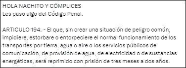 "Hola Nachito y cómplices. Les paso algo del Código Penal. ARTICULO 194. - El que, sin crear una situación de peligro común, impidiere, estorbare o entorpeciere el normal funcionamiento de los transportes por tierra, agua o aire o los servicios públicos de comunicación, de provisión de agua, de electricidad o de sustancias energéticas, será reprimido con prisión de tres meses a dos años", posteó el presidente.