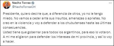 Minutos más tarde, el mandatario chubutense utilizó el mismo medio para seguir con la polémica: “Presidente, quiero decirle que, a diferencia de otros, yo no le tengo miedo. No vamos a ceder ante sus insultos, amenazas o aprietes. No creo en la violencia y voy a defender a los chubutenses hasta las últimas consecuencias”.