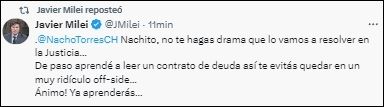 De inmediato, Milei volvió a atacar: “Nachito, no te hagas drama que lo vamos a resolver en la Justicia. De paso aprendé a leer un contrato de deuda así te evitás quedar en un muy ridículo off-side. ¡Ánimo! Ya aprenderás”.
