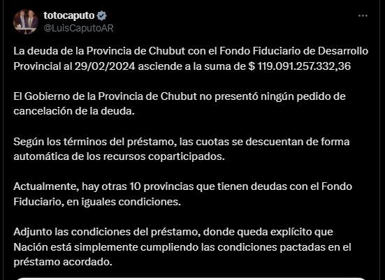 Tras estos cruces y acusaciones, el ministro de Economía de la Nación reaccionó en las redes sociales y manifestó: "La deuda de la Provincia de Chubut con el Fondo Fiduciario de Desarrollo Provincial al 29/02/2024 asciende a la suma de $ 119.091.257.332,36 El Gobierno de la Provincia de Chubut no presentó ningún pedido de cancelación de la deuda. Según los términos del préstamo, las cuotas se descuentan de forma automática de los recursos coparticipados".
