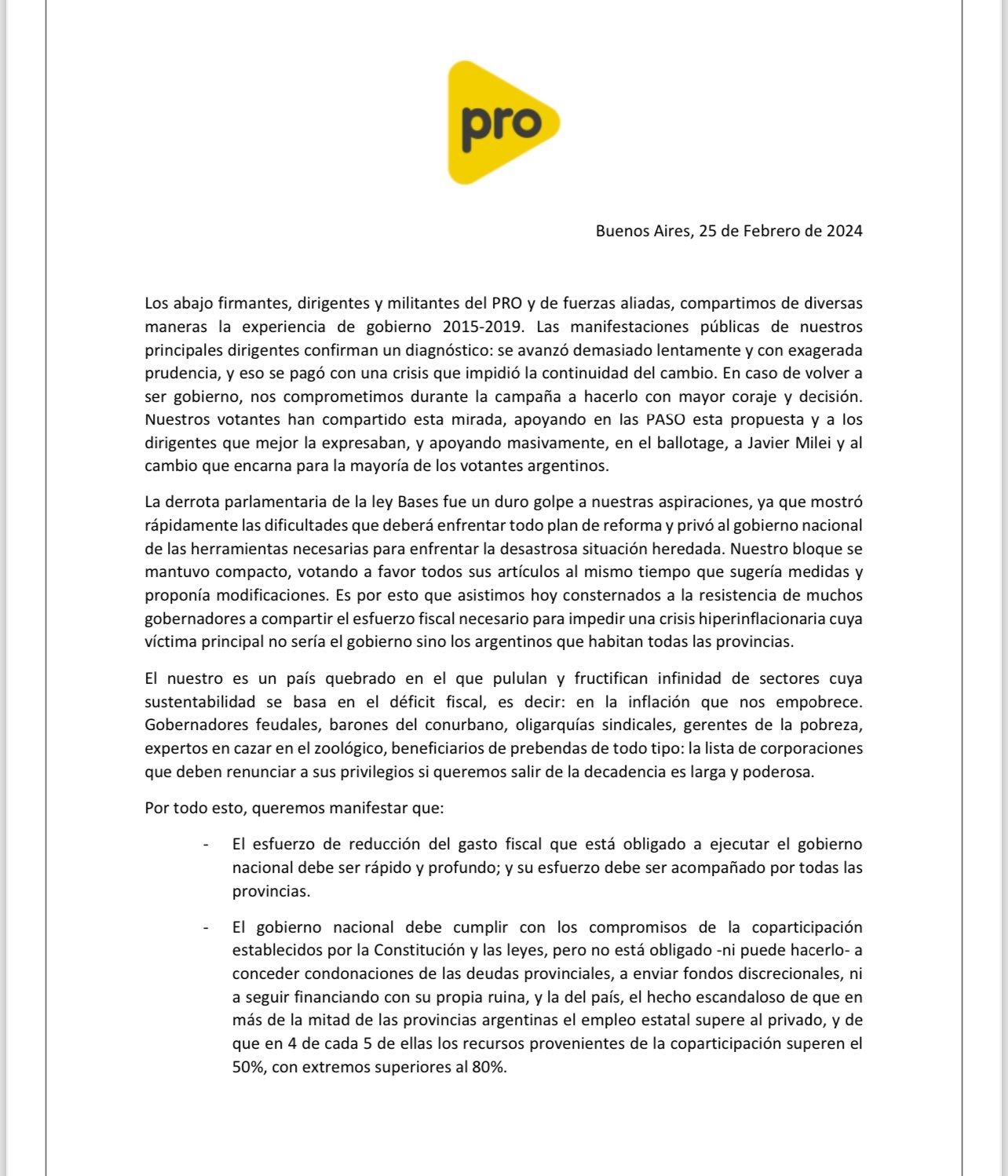 "La derrota parlamentaria de la ley Bases fue un duro golpe a nuestras aspiraciones, ya que mostró rápidamente las dificultades que deberá enfrentar todo plan de reforma y privó al gobierno nacional de las herramientas necesarias para enfrentar la desastrosa situación heredada. Nuestro bloque se mantuvo compacto, votando a favor todos sus artículos al mismo tiempo que sugería medidas y proponía modificaciones. Es por esto que asistimos hoy consternados a la resistencia de muchos gobernadores a compartir el esfuerzo fiscal necesario para impedir una crisis hiperinflacionaria cuya víctima principal no sería el gobierno sino los argentinos que habitan todas las provincias", sigue el escrito.
