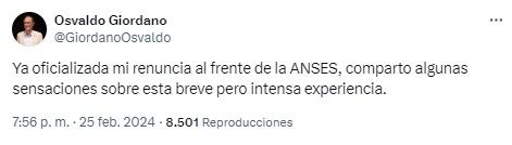 Tras confirmarse de manera oficial su salida, el extitular de la Anses, Osvaldo Giordano, compartió un mensaje donde se refirió a esta decisión y compartió "algunas sensaciones sobre esta breve pero intensa experiencia".