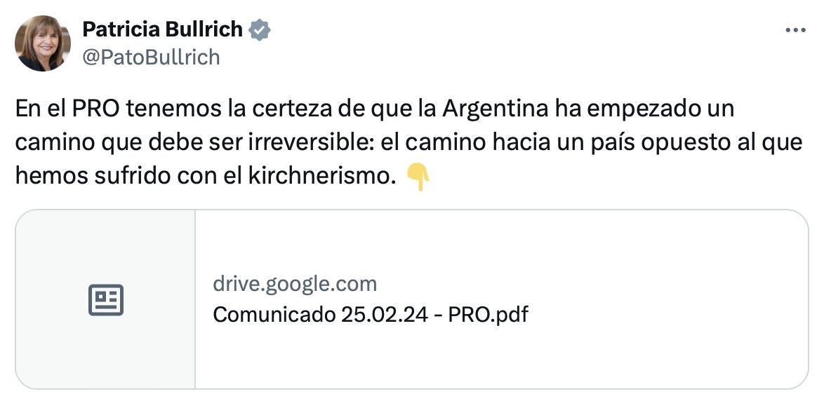 "En el PRO tenemos la certeza de que la Argentina ha empezado un camino que debe ser irreversible: el camino hacia un país opuesto al que hemos sufrido con el kirchnerismo", escribió en X (exTwitter) Bullrich, para compartir un documento de nueve páginas en donde se busca despegar de la actitud de los gobernadores, de distinto color político, que vienen teniendo una relación de tire y afloje con la gestión del presidente Javier Milei desde la caída de la ley ómnibus.