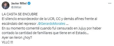 "La casta se encubre. El silencio ensordecedor de la UCR, CC (Coalición Cívica) y demás afines frente al escándalo del represor Gerardo Morales", escribió el mandatario en la red social X.