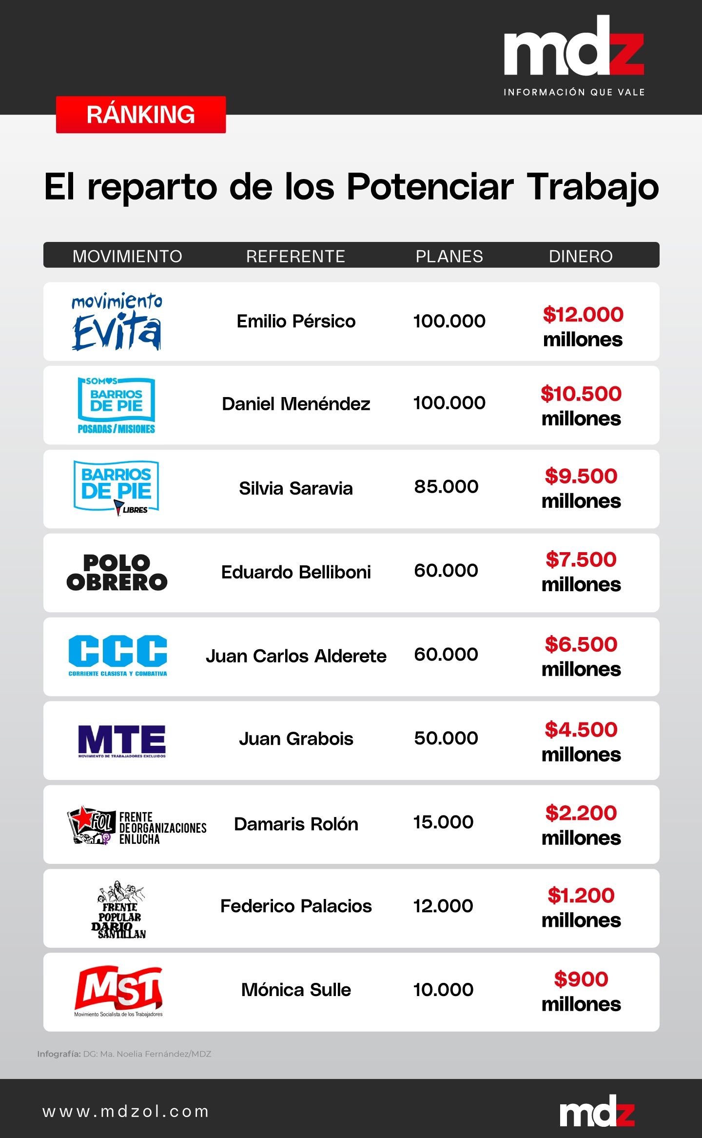 Solamente el Movimiento Evita cobra 7.800.000.000 de pesos cada treinta días por ese plan, es la organización que dirige el empresario gastronómico Fernando Navarro y Emilio Pérsico, junto a Leonardo Grosso. Aparte recibieron el año pasado cerca de 12.300 millones extras de subsidios y planes directos. Los líderes y punteros están en la mira, y el pedido presidencial es que avancen las investigaciones.