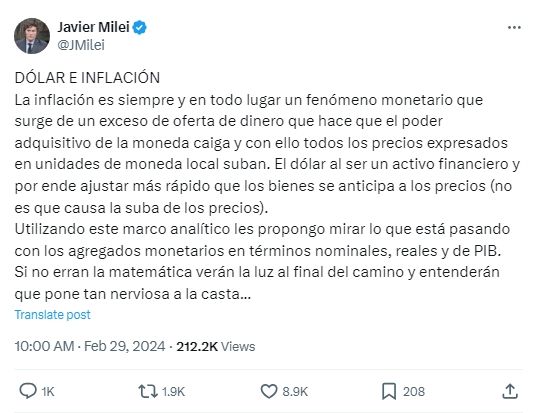 "La inflación es siempre y en todo lugar un fenómeno monetario que surge de un exceso de oferta de dinero que hace que el poder adquisitivo de la moneda caiga y con ello todos los precios expresados en unidades de moneda local suban", precisó en la primera parte de su posteo.