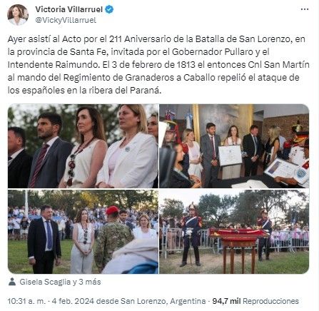 La visita de la titular del Senado a la provincia fue en el marco de un acto aniversario de la batalla de San Lorenzo. "Ayer asistí al Acto por el 211 Aniversario de la Batalla de San Lorenzo, en la provincia de Santa Fe, invitada por el Gobernador Pullaro y el Intendente Raimundo", expresó a través de sus redes sociales.
