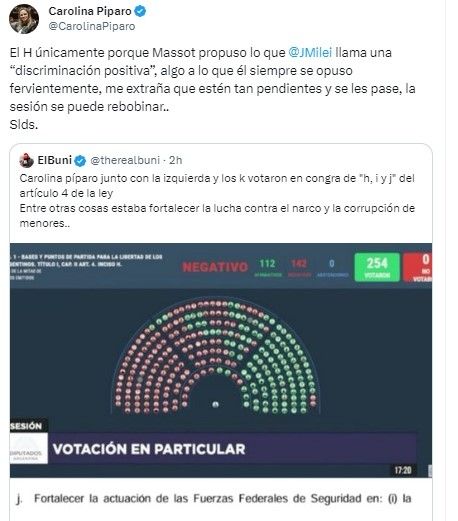 En este sentido, Píparo salió a aclarar su postura: "Únicamente porque Massot propuso lo que Javier Milei llama una ´discriminación positiva´"