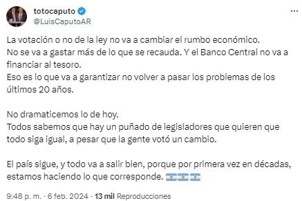 A través de la red social X, el jefe de Hacienda reiteró que se mantendrán las premisas principales, que incluyen la postura de no gastar "más de lo que se recauda" y con un Banco Central que "no va a financiar al tesoro".