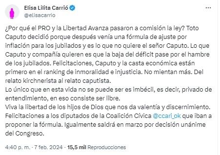 Cabe recordar que un día antes, Carrió apuntó contra los bloques dialoguista que votaron a favor de la ley ómnibus en medio de su tratamiento en Diputados.