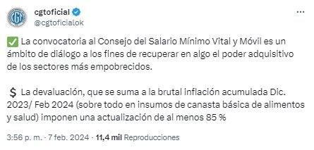 Por eso y una vez conocida la noticia mediante la Resolución N° 27/24 del Ministerio de Capital Humano, la CGT compartió un posteo en redes sociales: "El Consejo del Salario Mínimo Vital y Móvil es un ámbito de diálogo a los fines de recuperar en algo el poder adquisitivo de los sectores más empobrecidos".